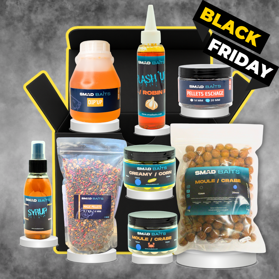 Le contenu ? Un kilo de bouillettes, 750g de magic pellets, un pot de pellets d’eschage, 2 pots de pop-ups, un syrup, un flash’up et un dip’up, à savoir que les arômes de chaque produit sont variables.